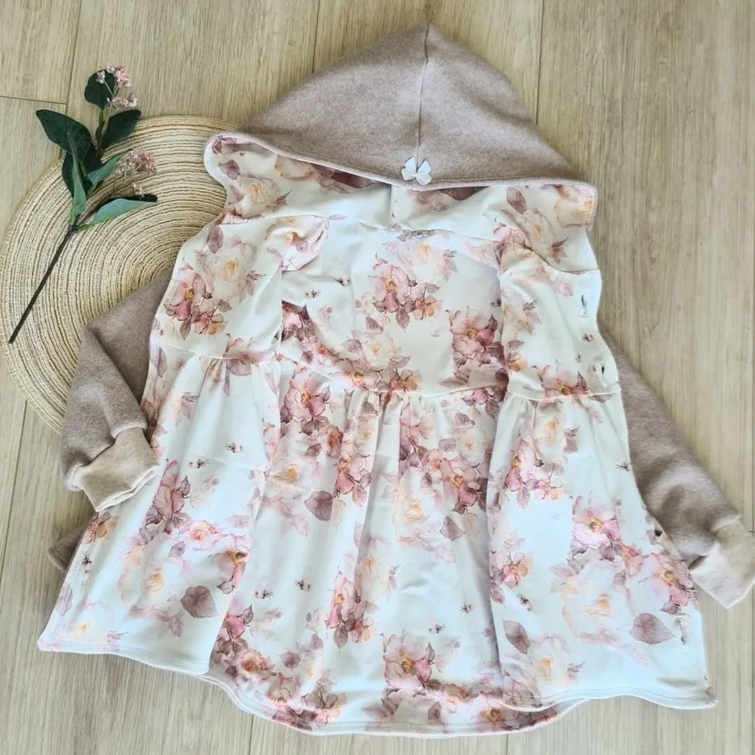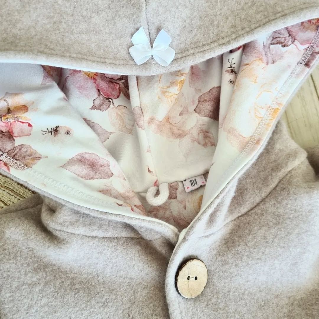 Hochwertige Bio Baumwollfleece Jacke mit Kapuze und Kokosknopfleiste in der Farbe beige. Die Jacke ist mit einem Jersey Stoff gefüttert. Der Baumwollfleecestoff ist wärmeregulierend, kuschelweich und einfach super gemütlich.