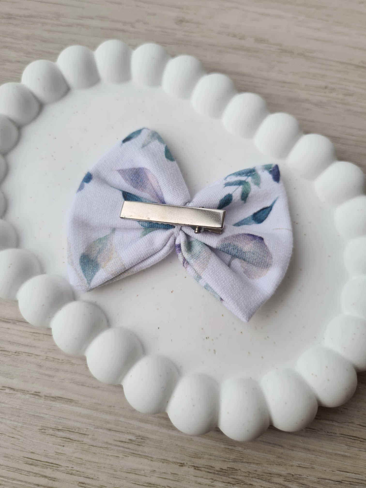 Die Schleife ist sorgfältig gearbeitet und formstabil, sodass sie ihre schöne Silhouette behält. Auf der Rückseite befindet sich eine sogenannte Krokodil-Haarspange, die für sicheren Halt sorgt – ganz ohne Ziepen.