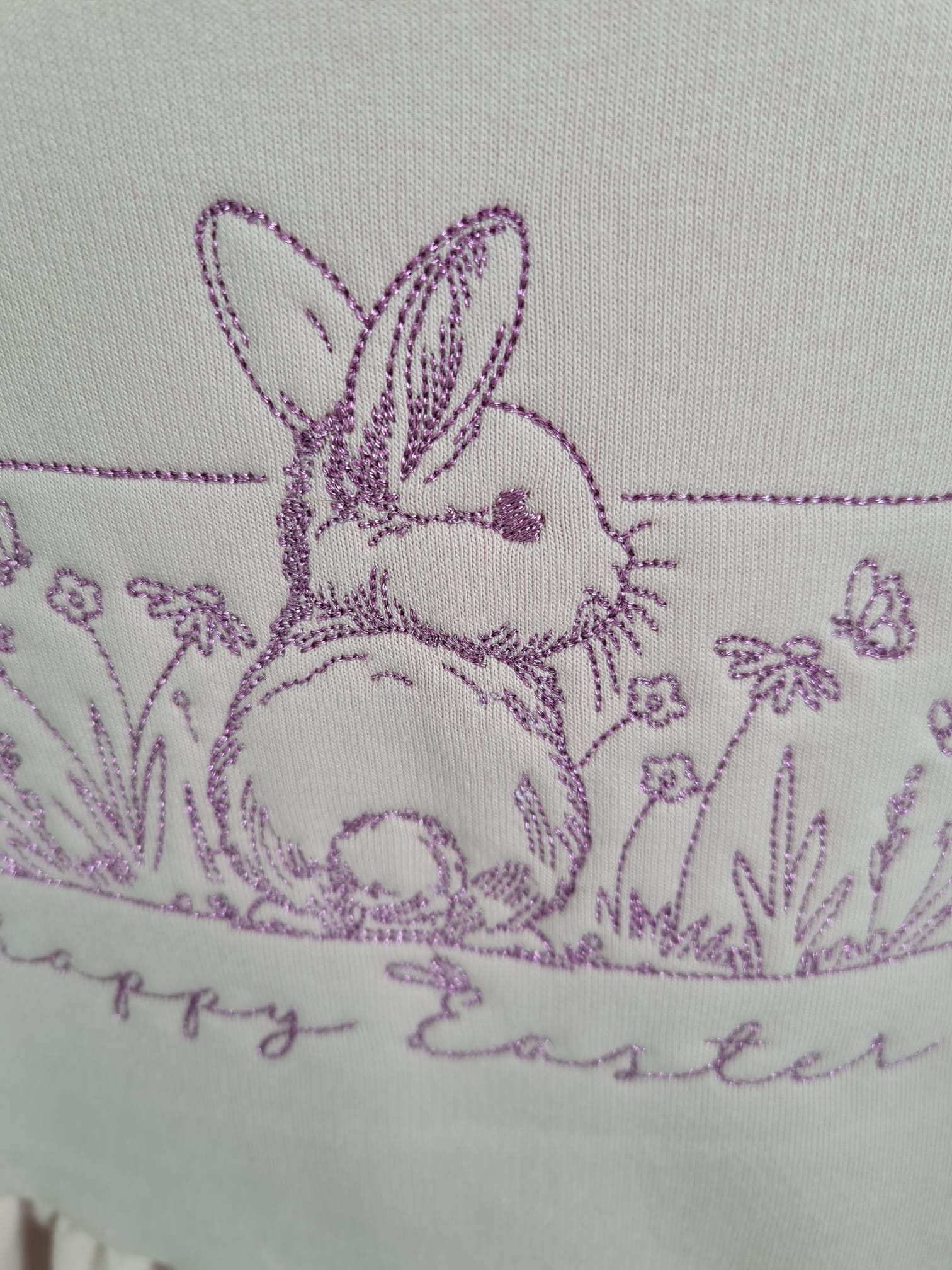 Ein besonderer Hingucker ist die feine Stickerei auf der Vorderseite mit Schimmergarn. Der Schriftzug „happy Easter“ und das niedliche Hasenmotiv verleihen dem Design eine verspielte und zugleich edle Note.