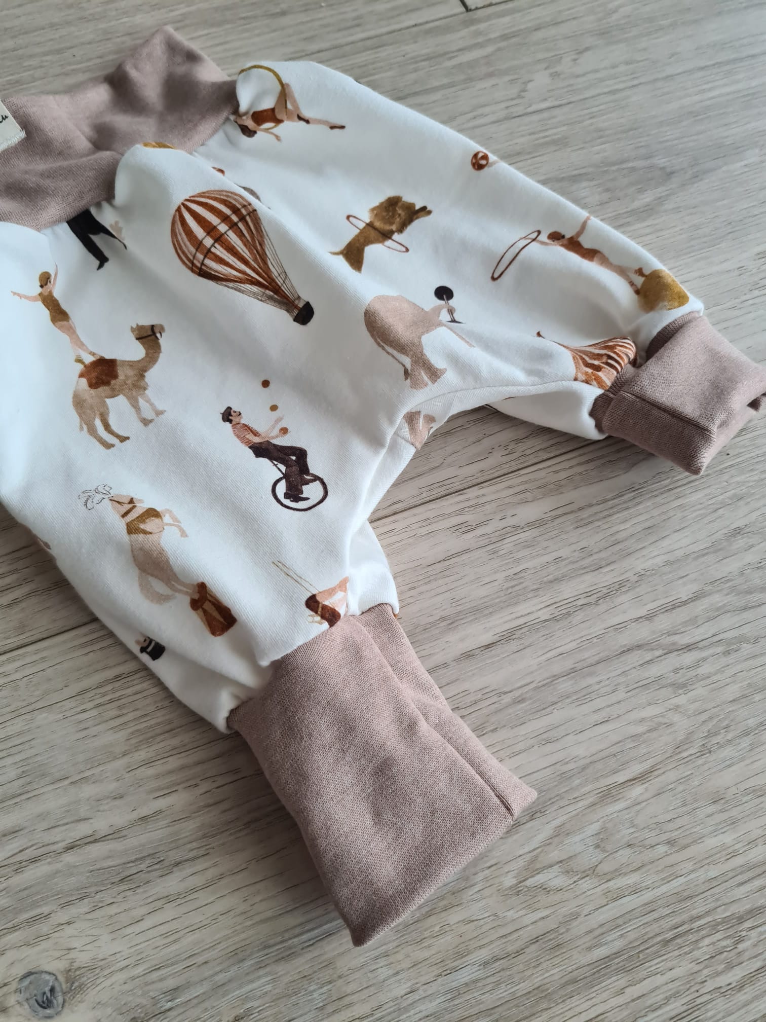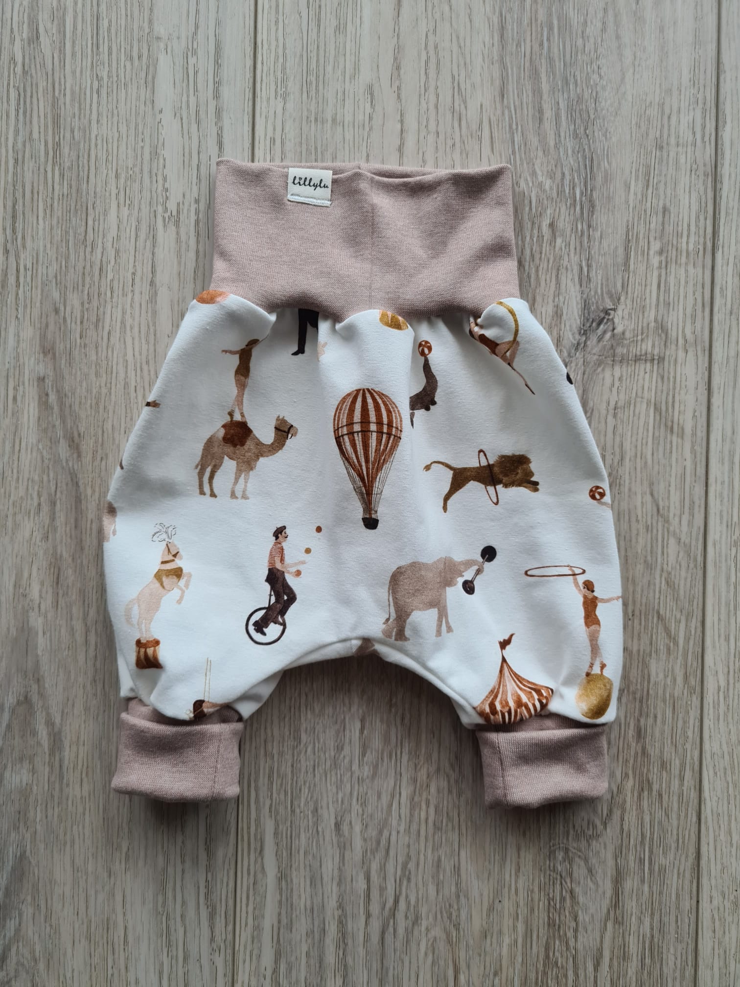 Ein echter Hingucker mit nostalgischem Charme: Diese Pumphose zeigt einen detailreichen Zirkusprint in warmen Natur- und Brauntönen. Von Akrobaten bis Heißluftballon – es gibt überall kleine Motive zu entdecken.