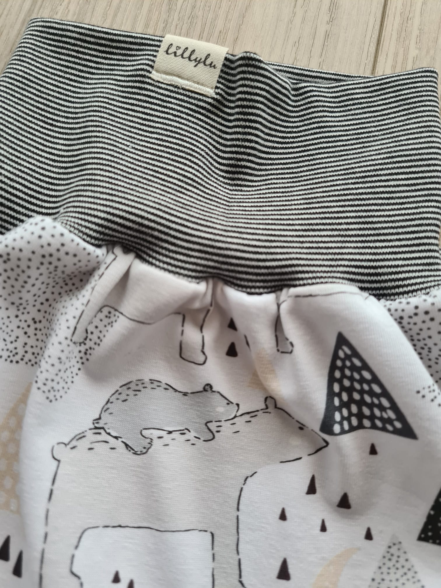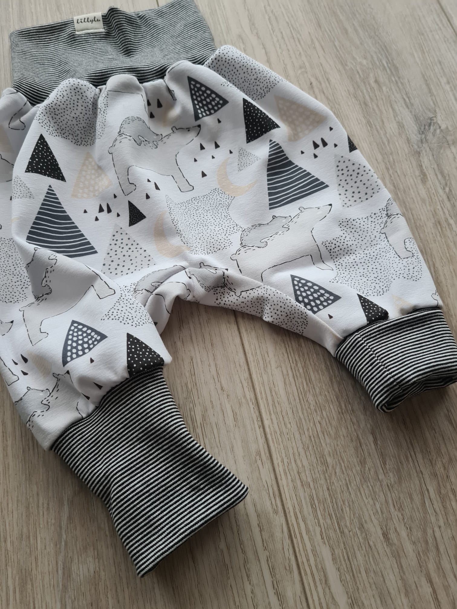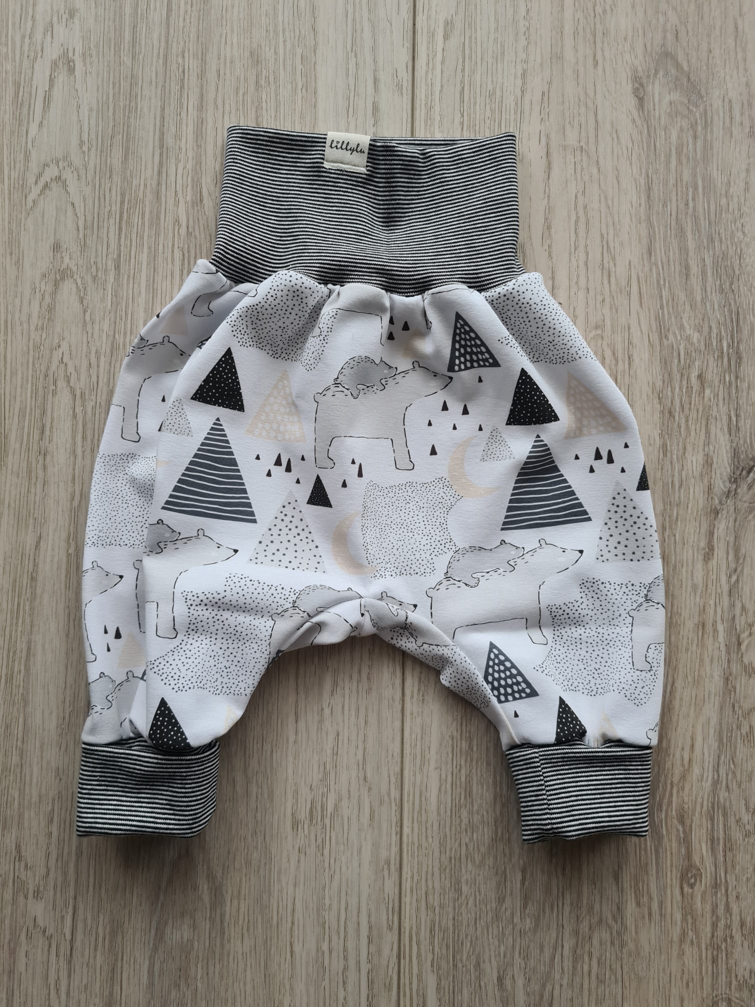 Diese Pumphose überzeugt mit einem minimalistischen Waldprint in klaren Grau- und Schwarztönen. Zwischen Bergen, Monden und kleinen Bären verstecken sich liebevolle Details, die dem Design eine moderne, nordische Note verleihen.