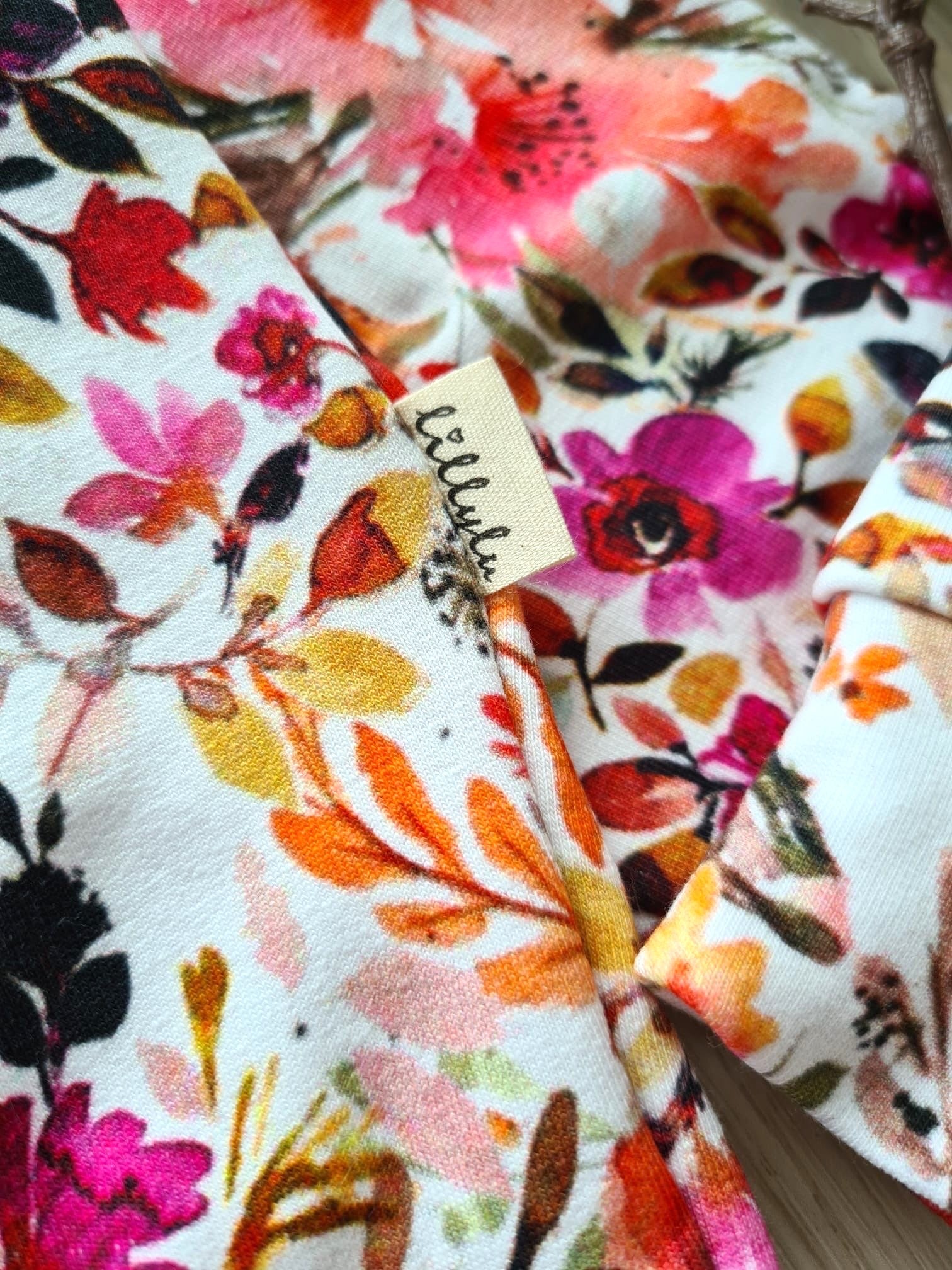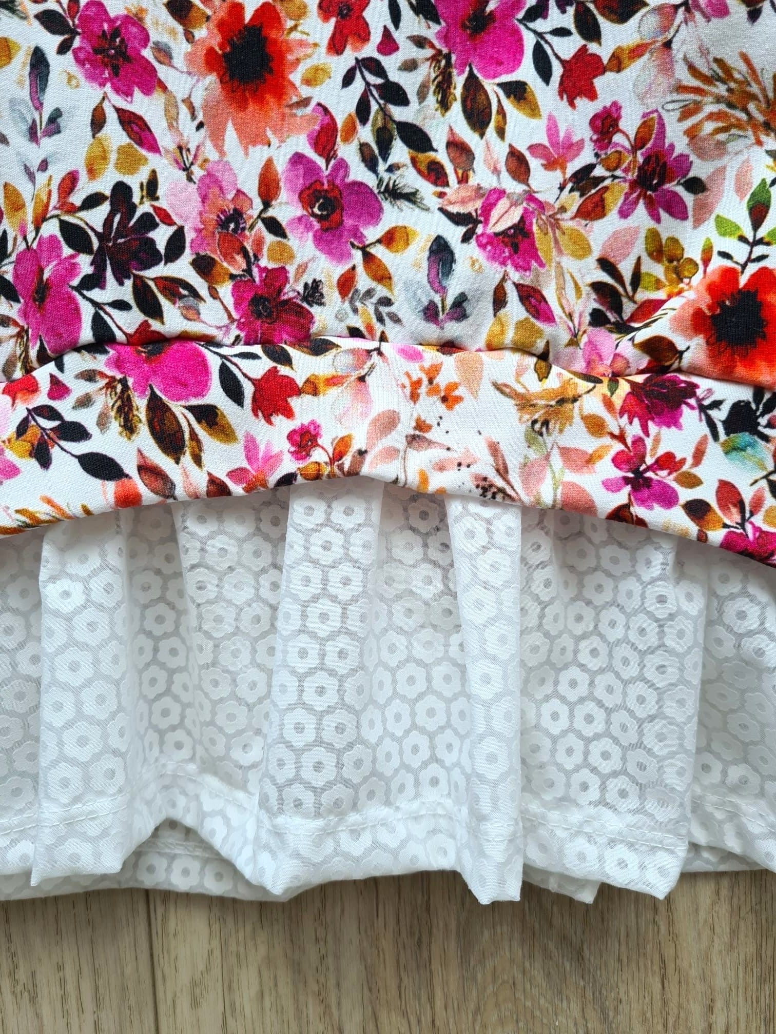Obenrum ein dünner, aber sehr kuschliger und weicher Sweatstoff. Der Rockteil unten ist aus reiner Baumwolle (Webmaterial) und hat kleine Blümchen drauf.